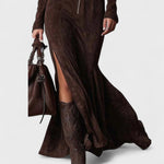 L’abito Tayli è pensato per la donna che desidera distinguersi con classe e personalità. Il suo taglio lungo e avvolgente, unito alla cintura in vita, scolpisce la silhouette e dona un fascino irresistibile ad ogni passo.
