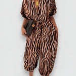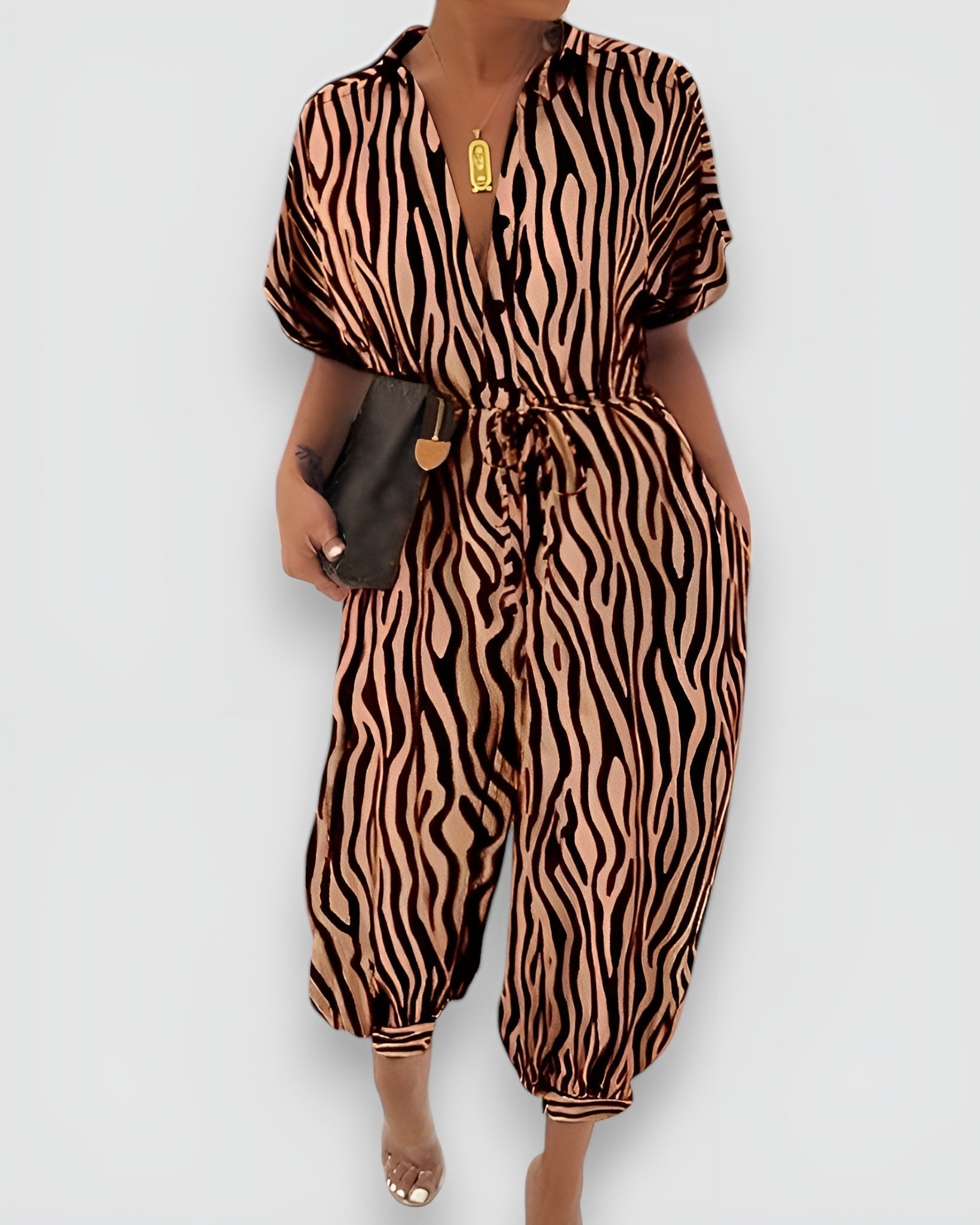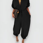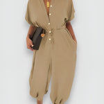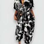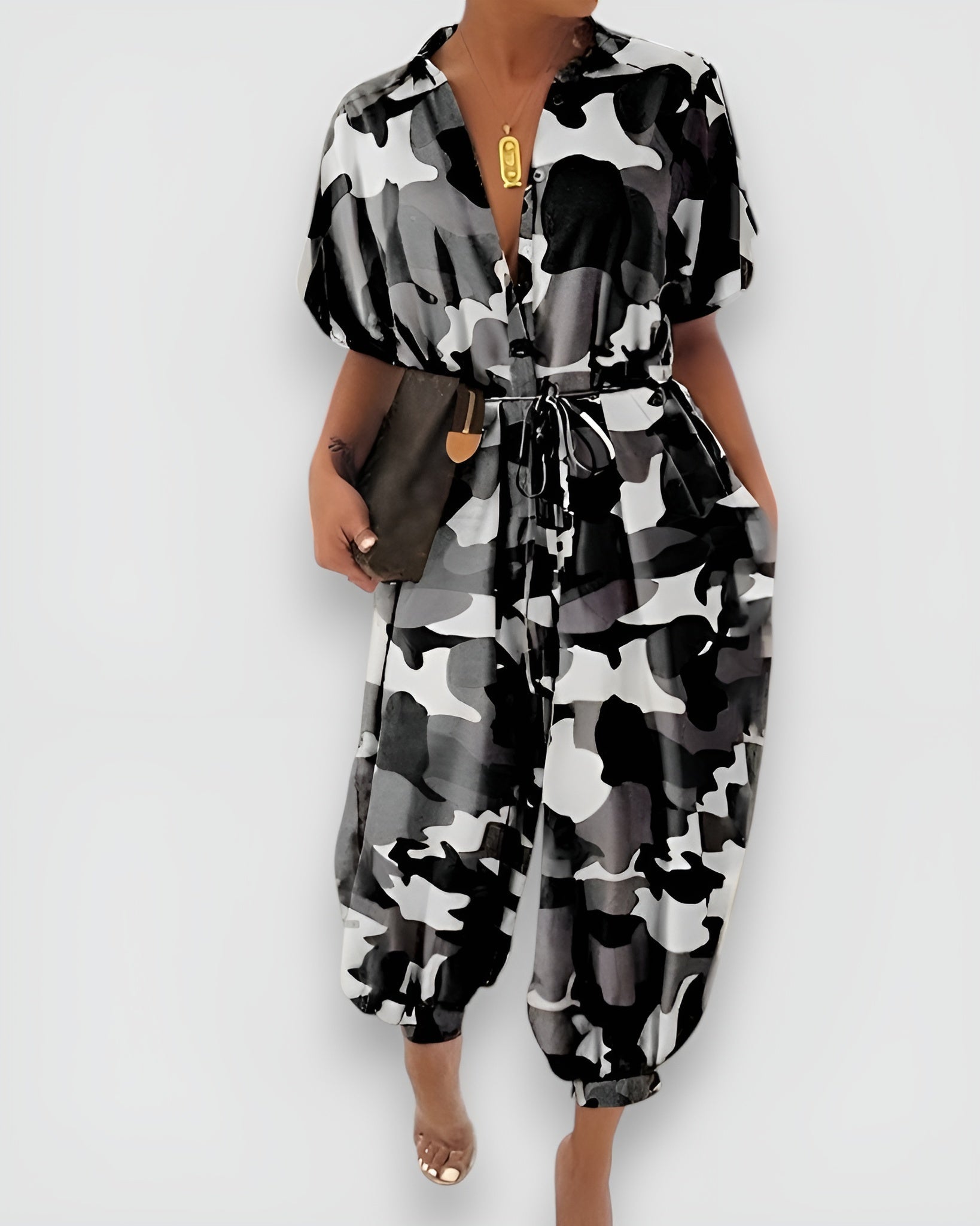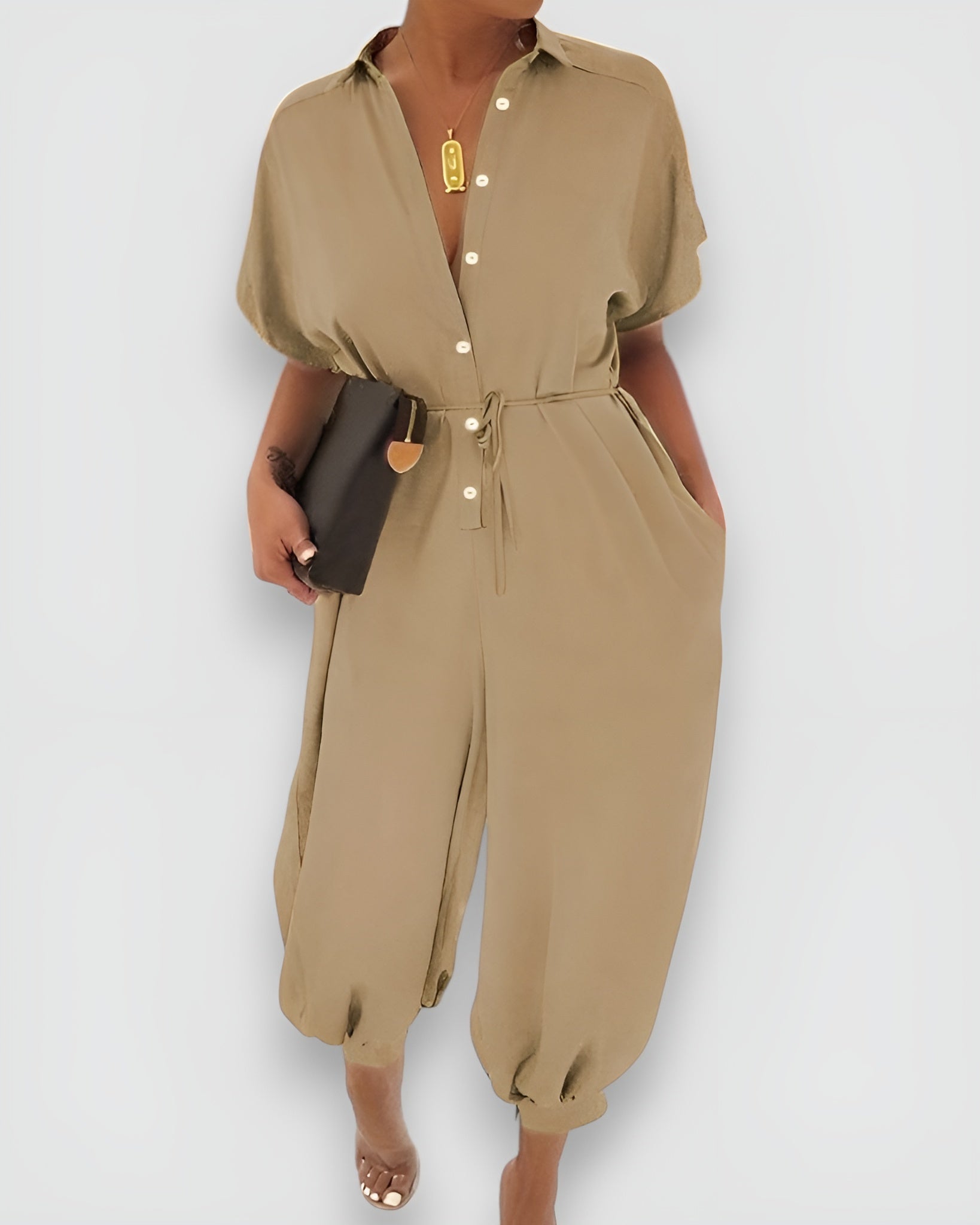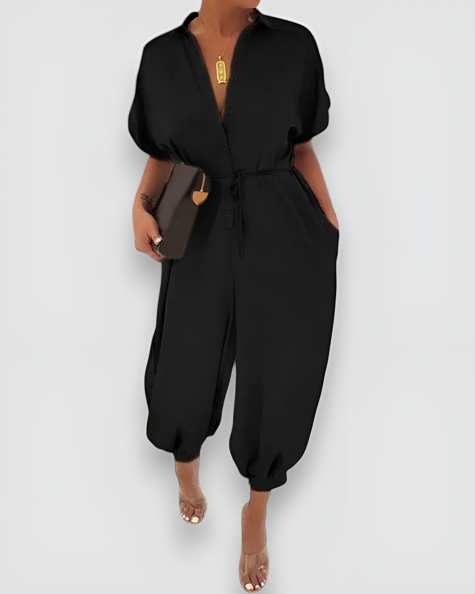 La Cinzia è una tuta che unisce perfettamente stile ed eleganza. Il design con scollo a V profondo, i bottoni decorativi e la cintura in pizzo creano un look raffinato, mentre la vestibilità morbida dona un aspetto moderno e femminile.