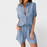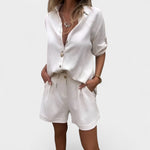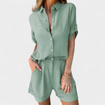 Questo completo due pezzi leggero, realizzato in morbido cotone, presenta una camicia frontale con bottoni rilassata, con maniche corte e polsini arrotolati per un aspetto informale. I pantaloni corti a vita alta abbinati hanno morbide pieghe e tasche laterali che combinano stile e funzionalità. Un semplice colletto e bottoni lucidi completano il look, rendendo questo completo perfetto per le giornate calde quando vuoi sentirti comoda e chic.