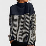Questo maglione presenta un motivo a zigzag accattivante che aggiunge un tocco unico ai tuoi outfit invernali. Abbinalo ai tuoi pantaloni o alla tua gonna preferita per un look chic e raffinato che trasmette sofisticatezza. Con il suo collo alto che ti tiene al caldo e le spalle scese per un taglio casual, si abbina bene sia a pantaloni che a gonne. Aggiorna il tuo guardaroba autunnale e fai una forte impressione ovunque tu vada.