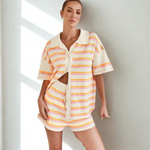 Entra nell'estate con il Set Coordinato in Maglia Aperta Goldie, il tuo ensemble ideale per un'eleganza rilassata e comfort per tutto il giorno. Caratterizzato da una camicia a maniche corte rilassata con una chiusura a bottoni e pantaloni corti coordinati, questo duo leggero offre una vestibilità lusinghiera e informale, ideale per le giornate più calde. La texture a righe in maglia aperta aggiunge un tocco chic e moderno che passa senza sforzo dal relax alle uscite del fine settimana.
