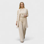 Il completo tre pezzi Nora è l’essenza della femminilità moderna: sofisticato, versatile e incredibilmente comodo. Realizzato con un tessuto morbido e fluido, abbraccia delicatamente la figura offrendo libertà di movimento e un tocco di lusso quotidiano. Il blazer leggero, i pantaloni eleganti e il top coordinato creano un look armonioso e impeccabile, perfetto per l’ufficio, una cena elegante o un evento speciale.