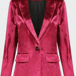 Una giacca dalla texture vellutata che dona lusso ed eleganza a qualsiasi outfit. Il suo colletto classico, abbinato al singolo bottone frontale, crea un perfetto equilibrio tra stile senza tempo e moderno. Ideale per uscite serali o occasioni speciali.