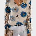Questo maglione a maglia fine con fiori viola e lavanda aggiunge un tocco sottile e femminile a qualsiasi outfit. L'inserto a manica larga permette di coprire le braccia senza compromettere il comfort, mentre il morbido scollo a V lo rende perfetto per essere abbinato a una collana o a una sciarpa.